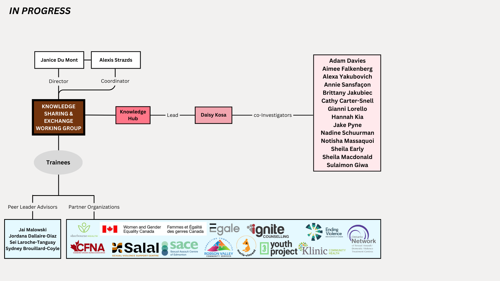 The Knowledge Sharing and Exchange Working Group will develop a central hub which will be supported by a Knowledge Mobilization Plan, and include) existing resources, new resources arising from the proposed project activities, an interactive map of diverse services and supports for TGD survivors across Canada, and a moderated members-only discussion board. The research section of the hub will include project recruitment materials, webinars, and in-person and virtual events, and highlight Network member organizations’ own projects.