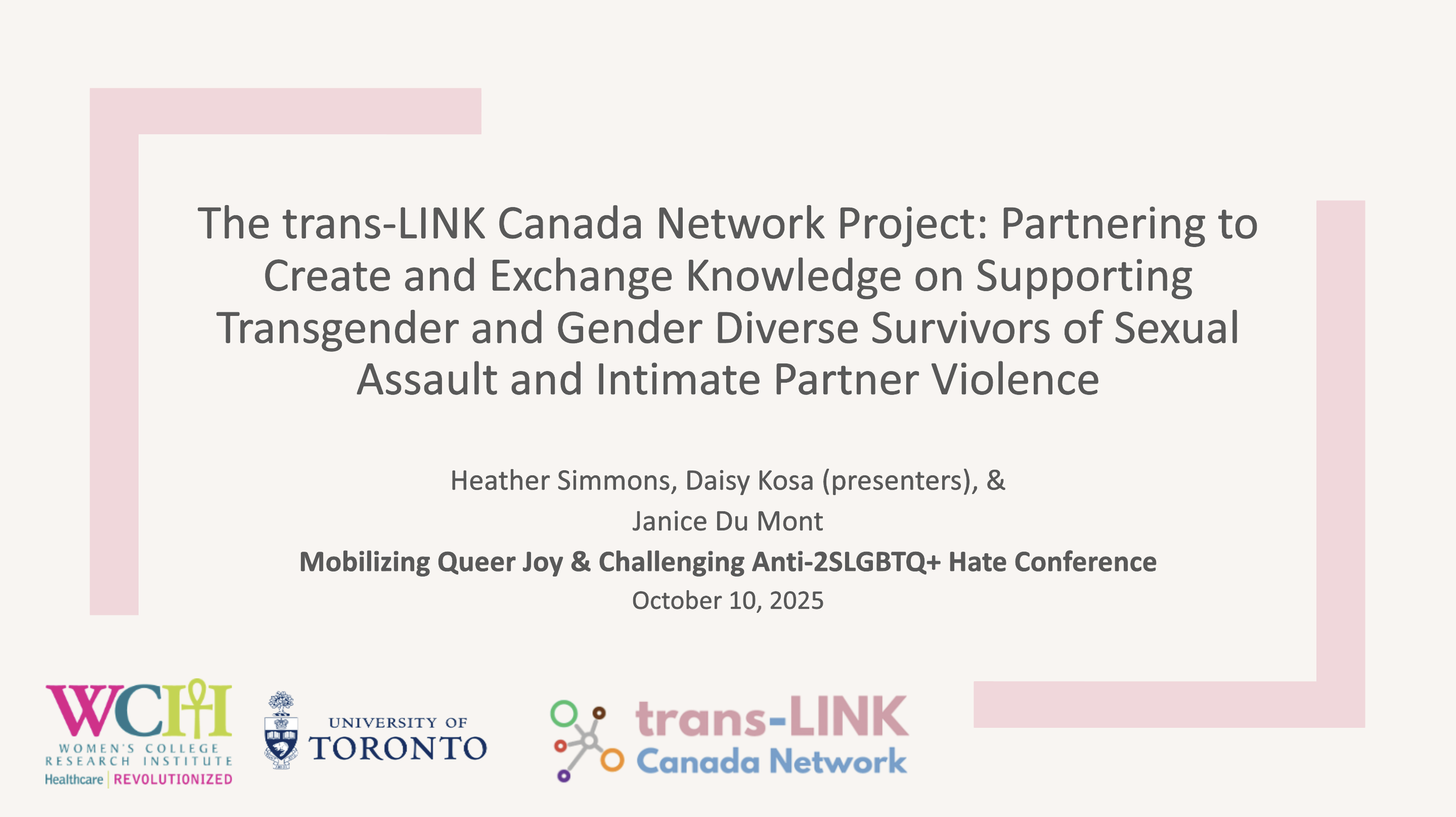 Cite as: Simmons, H., Kosa, S. D. (presenters), & Du Mont, J. (2025, October 10). The trans-LINK Canada Network Project: Partnering to create and exchange knowledge on supporting transgender and gender diverse survivors of sexual assault and intimate partner violence. Invited to present at the Mobilizing Queer Joy & Challenging Anti-2SLGBTQ+ Hate Conference, Edmonton, Alberta.
